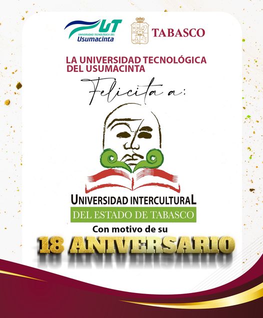 La Universidad Tecnológica del Usumacinta y su Rector el Dr. Jonathan José Canepa Segura, felicitan a la Universidad Intercultural del Estado de Tabasco , por motivo de su 18 aniversario; de igual manera el reconocimiento al Mtro. Alterio Ramos Pérez Pérez, Rector de esta institución por su labor a cargo de dicha casa de estudios.