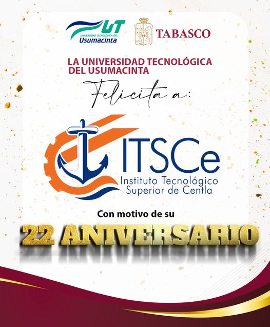 La Universidad Tecnológica del Usumacinta y su Rector el Dr. Jonathan José Canepa Segura, fraternalmente felicitan al “Instituto Tecnológico Superior de Centla”, por su 22 aniversario; y reconociendo al M.C.E. Guadalupe Arias Acopa, Director General del ITSCe por su ardua labor a cargo de esta unidad Universitaria. Tecnm Campus Centla 🎉